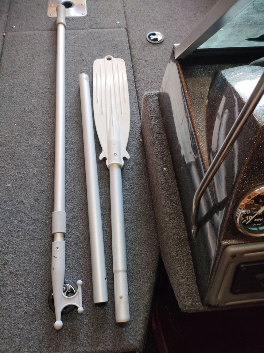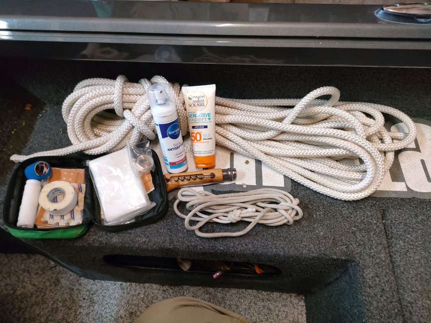 Pour les eaux intérieures abritées, qui correspondent à toutes celles qui ne sont pas exposées, la liste se réduit aux gilets de sauvetage, aux dispositifs anti-feu (extincteur et couverture anti-feu) et au mouillage (ancre). Il existe une réglementation spécifique pour le lac Léman. De même, si vous voyagez à l’étranger (en Hollande ou en Espagne par exemple), je vous invite à consulter les législations locales afin d’être toujours dans les clous lors d’un contrôle. À cette liste stricte je rajoute une rame, qui pourra peut-être un jour vous rendre de grands services. Il existe des modèles pliables ou démontables qui ne sont vraiment pas encombrants et se rangent facilement dans un coffre. À côté de cette rame se trouve une gaffe télescopique, que je pensais obligatoire. Je l’y ai laissée, car elle est fort utile pour passer une écluse, ou s’attacher à un corps mort par exemple. Au-delà du cordage obligatoire lié au mouillage, avoir une corde supplémentaire pourra toujours être utile pour sangler votre bateau en cas d’oubli des attaches rapides ou remorquer quelqu’un par exemple. Personnellement, j’ai aussi à bord quelques petits bouts de deux mètres de long. Peu encombrants, ils sont très utiles et faciles à déplier pour s’attacher à un ponton par exemple. Un seau et une éponge sont parfois bien utiles pour débarrasser une zone de sang ou de mucus après la prise d’un gros poisson.
