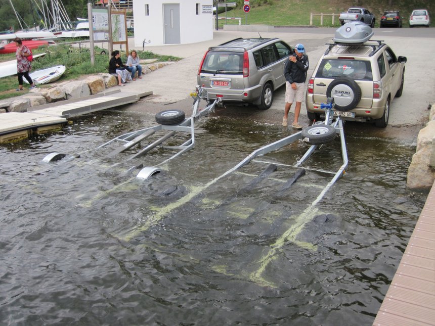 Avec une barque, la mise à l’eau ou sa sortie sont faciles. Équipez-vous d’une paire de cuissardes ou de waders et faites glisser la coque sur les patins ou les rouleaux. Avec un bateau, la manœuvre se révèle plus complexe puisqu’il se met généralement à l’eau et se sort au moteur. Il conviendra donc au préalable de noyer suffisamment le cul de sa remorque pour ensuite monter dans son embarcation et manœuvrer. Généralement, il faut noyer les roues de la remorque pour que la poupe du bateau porte sur l’eau. On peut aussi procéder en reculant vivement puis en freinant brutalement, le bateau sera entraîné par son poids et glissera sur les rouleaux. Pensez à l’attacher à la remorque avec une corde plus longue que cette dernière. Cette méthode fonctionne nettement moins bien avec des patins, qui ont tendance à coller à la coque. À deux, tout est plus facile ; l’un recule la voiture, le second guide la barque ou le bateau sur la remorque. Lors de la mise à l’eau, le premier s’écarte de la cale avec la barque pour laisser la place aux autres et le second va garer voiture et remorque. On gagne un temps précieux.