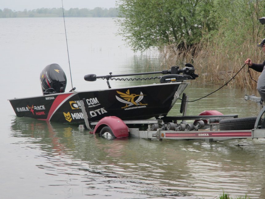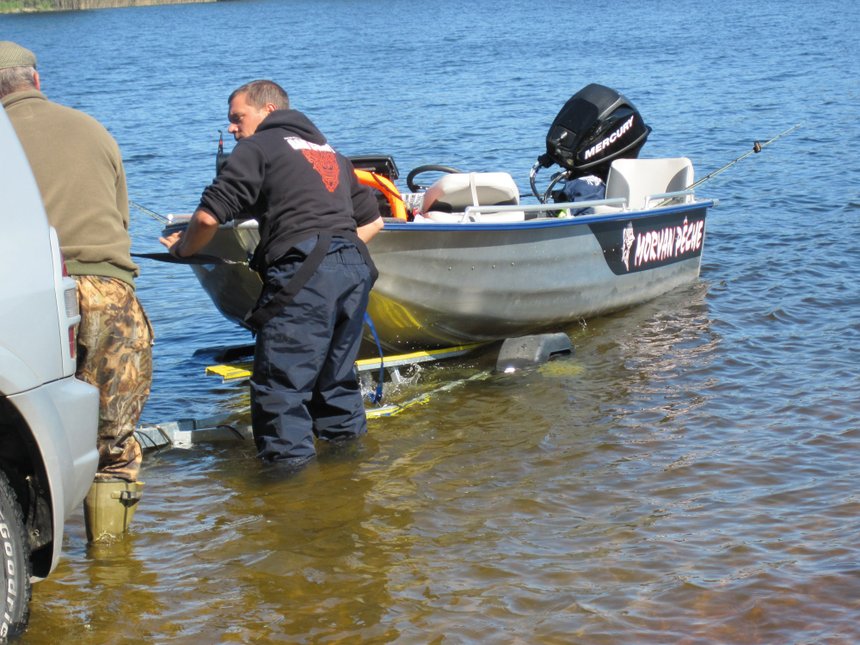 Si vous craignez pour vos roulements ou si la mise à l’eau n’est pas carrossable, on peut descendre la barque de la remorque sans que le cul ne touche l’eau. Avec des rouleaux, aucun problème, mais avec des patins, c’est plus dur et tout dépend de la taille et du poids de celle-ci. Avec un bateau cette méthode est impossible du fait de son poids. La remorque cassante est idéale. Une fois le timon articulé désaccouplé, elle prendra un angle favorable pour faire glisser ou remonter la barque sans avoir besoin d’en soulever le nez à la main. Si on peut mettre les roues dans l’eau, c’est plus facile et rapide. On recule jusqu’à ce que le cul du bateau porte sur l’eau et on sort soit au moteur pour les bass boat, soit à la main pour les barques. Idem pour remonter, on noie la partie arrière des patins et on monte le bateau au moteur ou à la main et au treuil. Tâtez le terrain si la cale n’est pas aménagée, une plaque de glaise, un trou et vous voilà embourbé même avec un 4 X 4 ! Ne négligez aucun élément et faites tout calmement, dans l’ordre, et surtout n’hésitez pas à demander de l’aide si vous ne savez pas reculer avec un attelage. Il vaut mieux paraître benêt que de se retrouver avec une remorque en porte-feuille ! Avec l’habitude et surtout en pêchant souvent avec les mêmes personnes, chacun a son rôle et tout se déroule vite et bien.