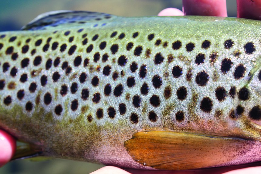 Ces cellules pigmentaires sont parfois bien visibles à l’œil nu. Il en existe de plusieurs sortes. Les lipophores sont la variété de chromatophores la plus représentée dans la peau de notre salmonidé. Ils sont localisés sur la première couche du derme. Ce sont eux qui sont responsables en grande partie de la couleur de la peau du poisson. Ils sont de nature très élastique et dépendent de l’activité musculaire environnante. À l’intérieur de ces cellules, on distingue deux types de pigments : des nuances de jaune, d’une part, et de rouge-orangé d’autre part. Ainsi, lors de la contraction, les lipophores se rétractent avec tout le pigment qu’ils contiennent. C’est le processus inverse qui s’opère lors de la décontraction. En dessous de cette couche sont regroupés les iridophores et les leucophores. Ces deux cellules sont très similaires. Leur rôle premier est de réfléchir la lumière pour générer un aspect iridescent et métallique. Les couleurs renvoyées seront des nuances de bleu et de vert qui dépendront de l’orientation des cellules, également grâce à un jeu de contraction. Puis, il y a l’ultime couche où se concentrent les mélanophores qui, eux, contiennent un pigment noir-marron. Cette catégorie dispose d’un fort pouvoir de dispersion à travers le derme grâce à un réseau de canaux. Ces cellules sont ainsi capables de recouvrir si besoin les autres variétés de chromatophores.