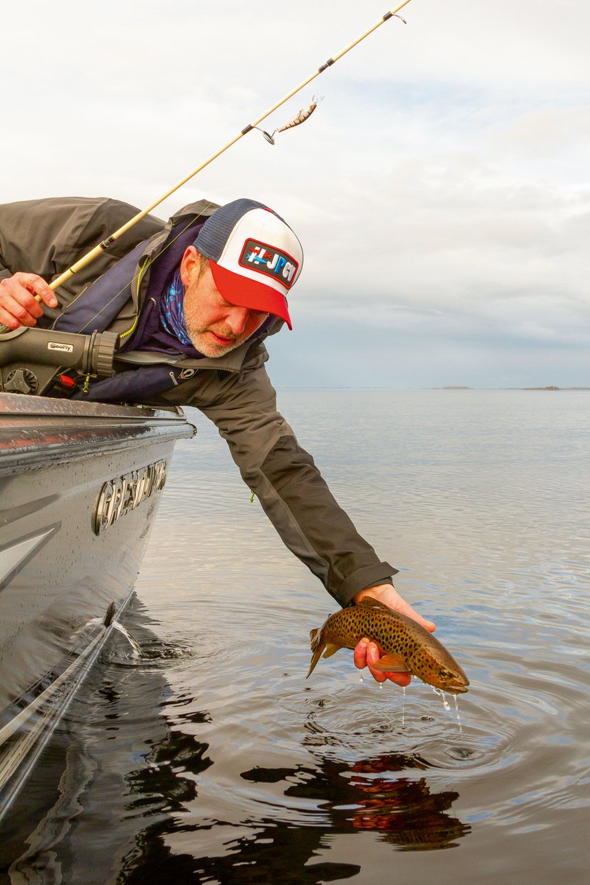 Délivré, libéré, je reprends la pêche après avoir rapidement immortalisé ce modeste poisson en photo ! « Il y a beaucoup plus gros », lance J.P. ! Et mettant la main à sa poche, il sort son téléphone rempli de photos de poissons comme, aujourd’hui, tous ceux des pêcheurs… Il fait défiler les clichés et au milieu j’aperçois quelques monstres, des truites de plus de 80 cm. « Ah ça, ce sont des férox », reprend le guide. On ira faire un coup de traîne pour essayer d’en prendre une un peu plus tard. Rien que le nom de cette truite est évocateur : férox ! Et le matériel pour la traquer l’est tout autant. J.P. tend deux cannes à l’arrière de son bateau, des triques qui ne broncheraient pas sous les coups de tête d’un brochet métré, c’est sûr ! Au bout du bas de ligne, il accroche des leurres articulés de plus de 20 cm et navigue en faisant des huit dans les meilleurs secteurs du lac connus pour abriter ces salmonidés géants. Une espèce à part qui peut dépasser 90 cm et peser près de 10 kg.