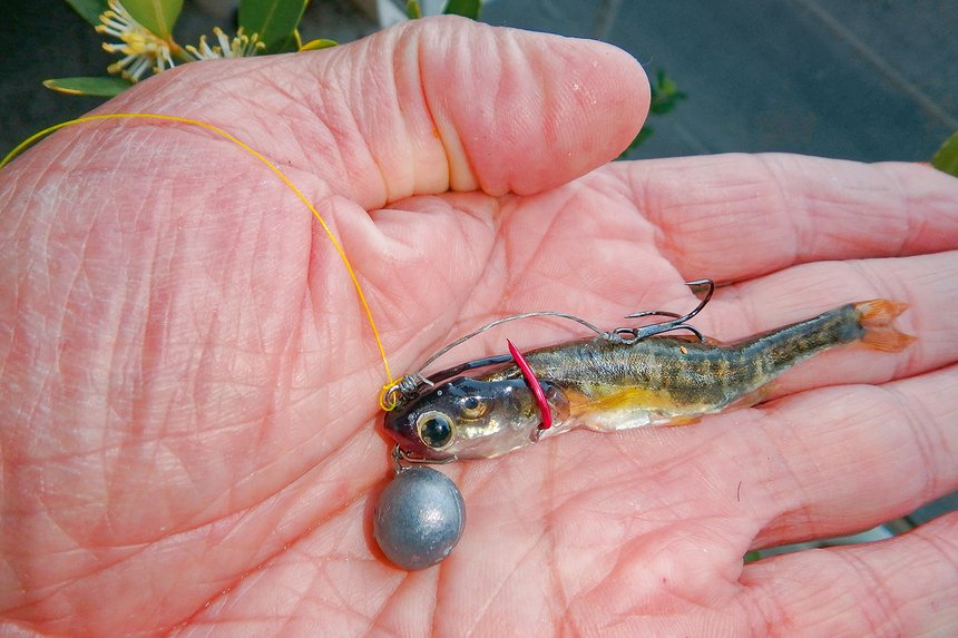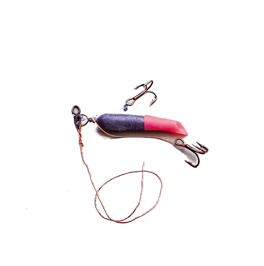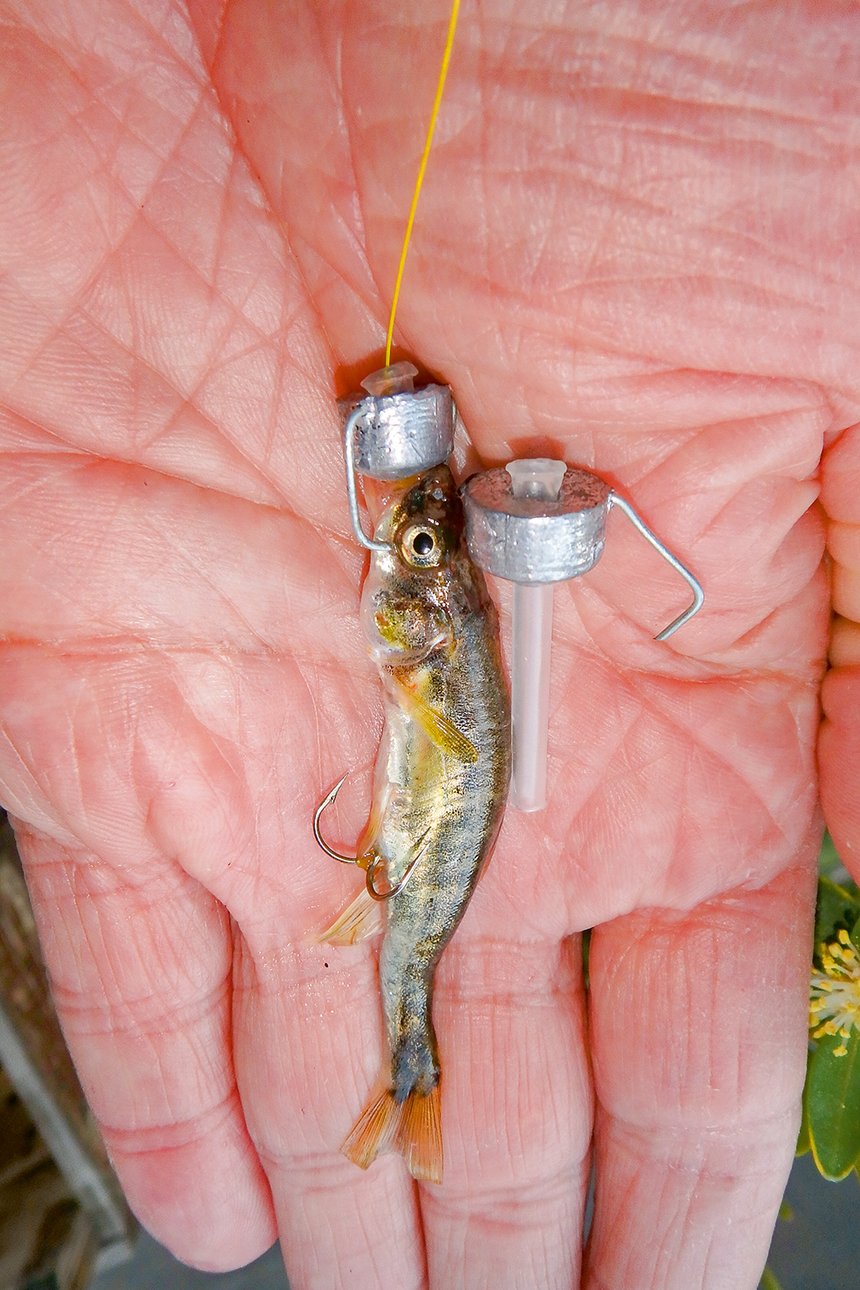 La monture Armorvif, créée par un éleveur de vairons, nous vient évidemment des côtes d’Armor ! Elle est géniale de simplicité car fabriquée à partir d’une simple épingle en corde à piano sur laquelle est enfilée une chevrotine percée en son centre. Un seul triple n°10 à 12 au bout d’une empile constitue l’armement. Elle permet de pêcher avec un vairon vivant piqué par une narine et retenu par l’agrafe.