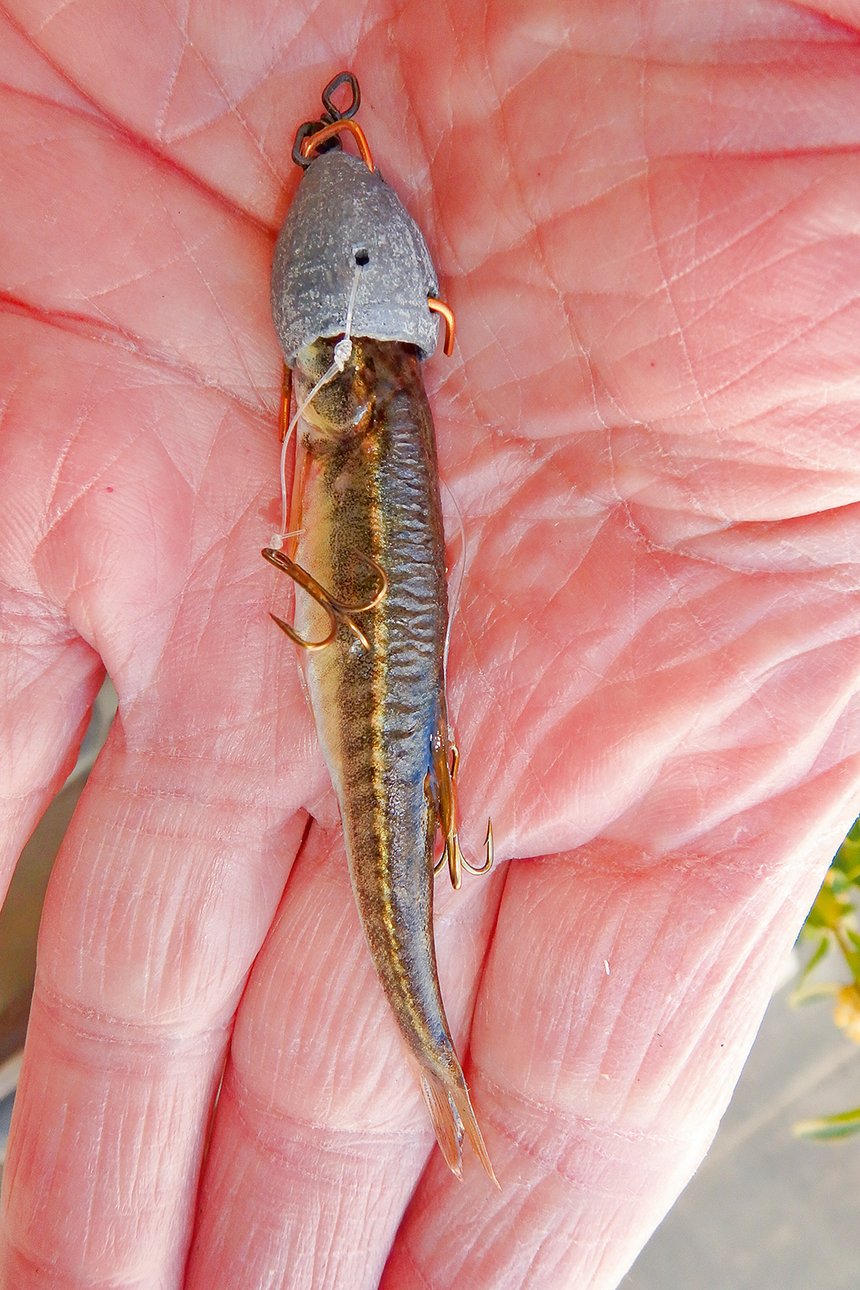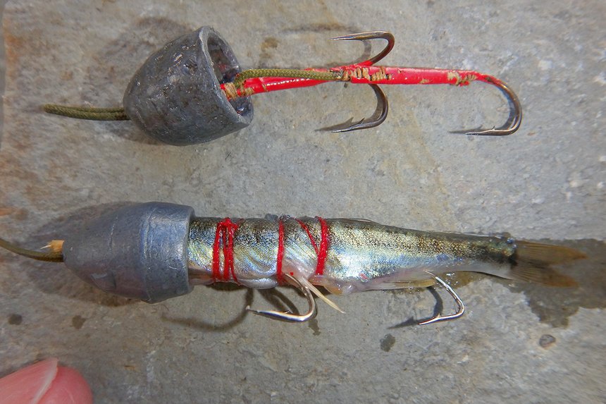 Les montures à casque, dont la « Bohémienne » est certainement une des plus anciennes. Elle n’a rien perdu de son efficacité. Elle trouve son principal usage dans les petits ou moyens cours d’eau, généralement avec une canne longue. On la dandine quasiment sous la canne pour prospecter des postes précis. Mais on peut aussi l’utiliser à distance, avec une canne à lancer. C’est ainsi que pratiquent les pêcheurs suisses ou savoyards qui s’en servent avec un cadre en guise de moulinet. Une fois le vairon monté, c’est celle qui paraît la plus naturelle, car son armement fait d’un hameçon simple en queue et d’un double à l’avant est idéalement positionné et discret. Son seul inconvénient est le montage fastidieux du vairon, car il faut d’abord le décapiter et le vider pour placer les hameçons. Ensuite, il faut le ligaturer sur la monture avec du fil à coudre, de préférence rouge. Un petit bout de cure-dent ou d’allumette coince le bas de ligne dans le trou central du casque. Il est astucieux d’en préparer plusieurs à l’avance.