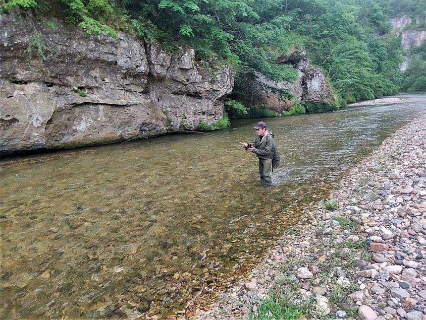 Le blank de l’Hexium Full Flex est un bon compromis. Sa partie haute, scion et inter, est souple mais nerveuse, ce qui assure idéalement la propulsion de nymphes légères. Cette flexibilité minimise les décrochages. Malgré sa finesse, 10 mm à l’entrée de la poignée, l’élément talon de la canne, d’aspect spiralé, garantit une bonne réserve de puissance afin de venir à bout des beaux poissons.