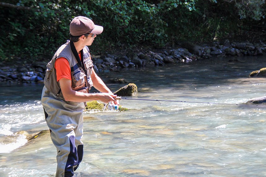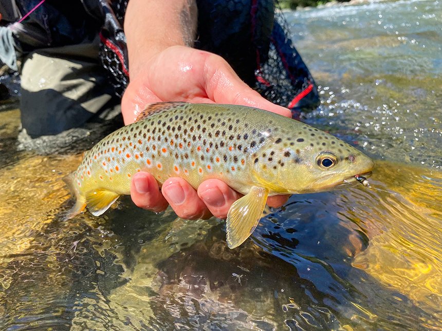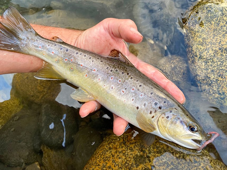 Pêcher au bon endroit et au bon moment ne suffit pas. Il faut s’adapter au comportement des truites qui préfèrent les petites proies évoluant plutôt décollées. Il faut donc pêcher petit et léger. Au leurre, c’est le moment de sortir les cuillères tournantes en taille 0 voire 00 pour prospecter les petites rivières. Optez pour les petits poissons nageurs suspending et les mini leurres souples montés sur des têtes plombées légères pour une présentation en dérive. Au toc, si les appâts classiques (petits vers notamment) peuvent fonctionner tôt le matin, des appâts de saison comme la mouche naturelle ou les larves aquatiques leur sont supérieurs, sans oublier la sauterelle en ruisseau. Attention à affiner les bas de lignes et à alléger et étaler la plombée, pour obtenir une présentation plus douce et décollée. À la mouche aussi, il faut réduire la taille des imitations. La boîte doit donc absolument contenir des « micro-mouches » sur hameçon n° 20 ou moins, mais aussi des fourmis, incontournables en été. Et en nymphe, les petites perdigones sont reines pour pêcher au fil. Bien sûr, pêcher la truite au cœur de l’été n’est pas facile, mais on peut toujours se faire plaisir, et il y a parfois de belles surprises. On est toujours bien au bord de l’eau, et prendre quelques truites dans ces conditions difficiles, c’est très gratifiant ! Faites-vous plaisir !
