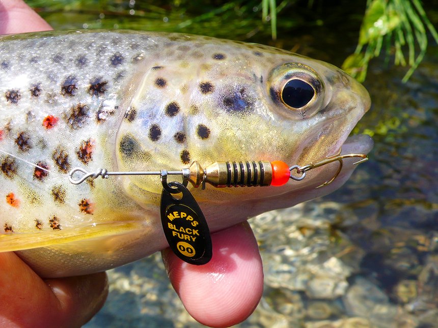 Est-ce parce que le noir affine et donne donc une impression de taille plus réduite aux leurres et aux appâts ou est-ce pour une autre raison? Mais l’été est bien la saison du noir. Les petites mouches sombres sont régulièrement les plus efficaces. La mouche naturelle supplante souvent tous les appâts dès que la lumière est vive. Et les micro-cuillères aux palettes noires comme la célèbre Black-fury de Mepps font fréquemment la différence dans ces conditions