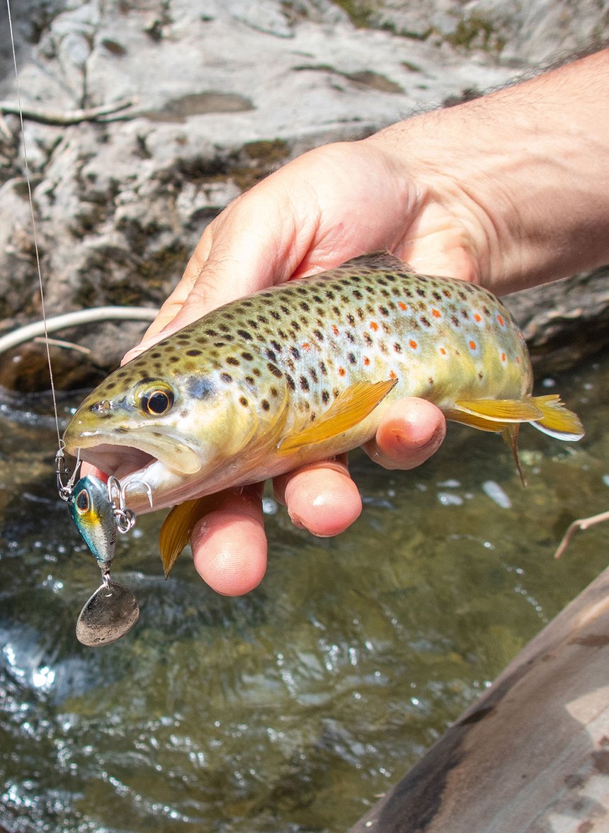 L’ondulante est très rarement mon premier choix et pourtant, si je fais le rapport entre temps de pêche et touches obtenues, elle est redoutable et se lance toujours très bien. La Lightning Wobbler, fabriquée au Japon, est l’une des rares références disponibles dans une gamme si étendue (6 modèles) et de nombreux coloris bien pensés pour les truites. Sa forme en S est adaptée au courant et rend sa nage très versatile. Les 3,5, 5 et 7 g sont parfaites pour la pêche en petit ou moyen cours d’eau vers l’amont quand il faut provoquer les farios avec des animations de type minnow coulant. En lancer-ramener en grande rivière, les modèles de 10, 14 et 18 g sont une véritable alternative à la grosse tournante: ils envoient des signaux différents et tirent moins. À armer obligatoirement car livrée sans hameçon.