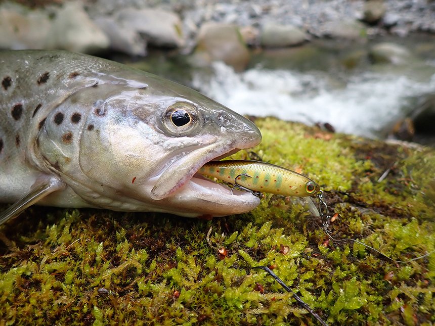 Le meilleur leurre à truite que je connaisse ! Ce poisson-nageur japonais tout terrain, dense et ultra plat, est parfaitement adapté aux petits et moyens torrents. Il se faufile extrêmement bien dans les turbulences. Il est terriblement attractif quand on l’anime : virevoltant ou vibrant, selon la force du courant et le geste prodigué. Comme aucun autre minnow coulant, il permet de pêcher sous la canne dans les petites fosses avec des animations quasi verticales comme avec une ondulante. Bref, dans les tailles 44 et 53, une véritable machine à capturer des farios. La nage du 64, qui est sorti récemment, ne me convient pas parfaitement et en grande rivière je préfère basculer sur une autre forme. On pourra rééquiper le D-Incite avec des triples de tailles identiques mais légèrement plus forts de fer ou des simples car les originaux sont certes ultra-piquants mais un petit peu trop fins.