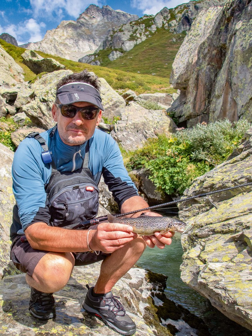 L’épuisette est incontestablement une alliée précieuse pour écourter les combats et assurer ses belles prises. Elle est aussi utile pour conserver les farios dans l’eau avant une éventuelle photographie lorsque l’on ne prélève pas. Le meilleur système de portage – ou plutôt le moins mauvais – consiste alors à l’accrocher au dos du gilet ou du chest pack avec un clip aimanté accompagné d’un cordon de sécurité pour ne pas la perdre quand elle se détache accidentellement. Elle est toutefois, selon moi, un outil très encombrant qui présente plus d’inconvénients que d’avantages mis sur la balance, surtout pour un débutant. C’est d’abord un investissement supplémentaire d’une quarantaine d’euros. Et surtout, elle finit toujours à un moment ou à un autre par s’accrocher à la végétation ou à se détacher lors des petits sauts et des franchissements de blocs, et cela même en ayant pris soin de choisir un aimant ferme. De plus, il n’y a pas plus nerveux qu’une fario, et quel que soit le filet retenu (ceux recouverts de plastique sont les moins mauvais), les hameçons ont une fâcheuse tendance à s’entortiller dans les mailles, surtout les triples. Personnellement je n’utilise donc l’épuisette que pour pêcher les grandes rivières dégagées ou quand je prends des photos pour votre magazine préféré.