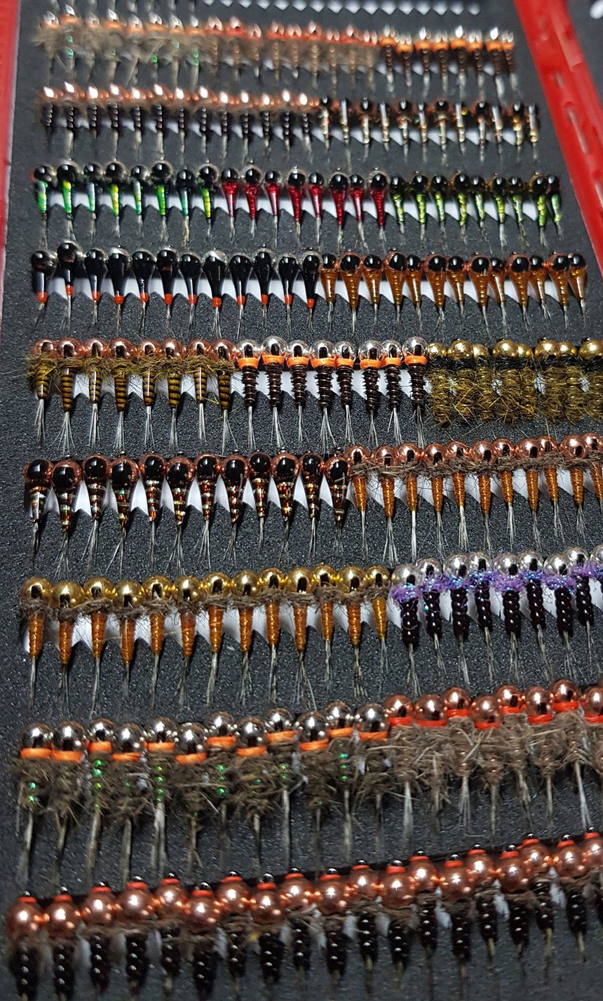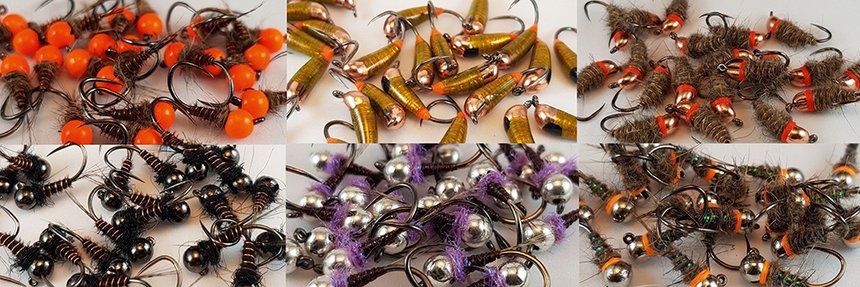 Poids : les lestages des nymphes sont exprimés en millimètres, qui correspondent au diamètre de la bille tungstène utilisée. Les poids les plus fréquents varient de 2,4 mm (+/- 0,1 g) à 4 mm (+/- 0,5 g). Pour les lestages les plus élevés, il est possible d’utiliser des javis (corps intégralement en tungstène) qui présentent des poids de 0,5 g, 0,75 g, 1 g ou encore 1,5 g. Les choix doivent être effectués en fonction de la puissance et de la profondeur des veines d’eau pêchées et par le comportement que l’on souhaite donner à la dérive des imitations.
