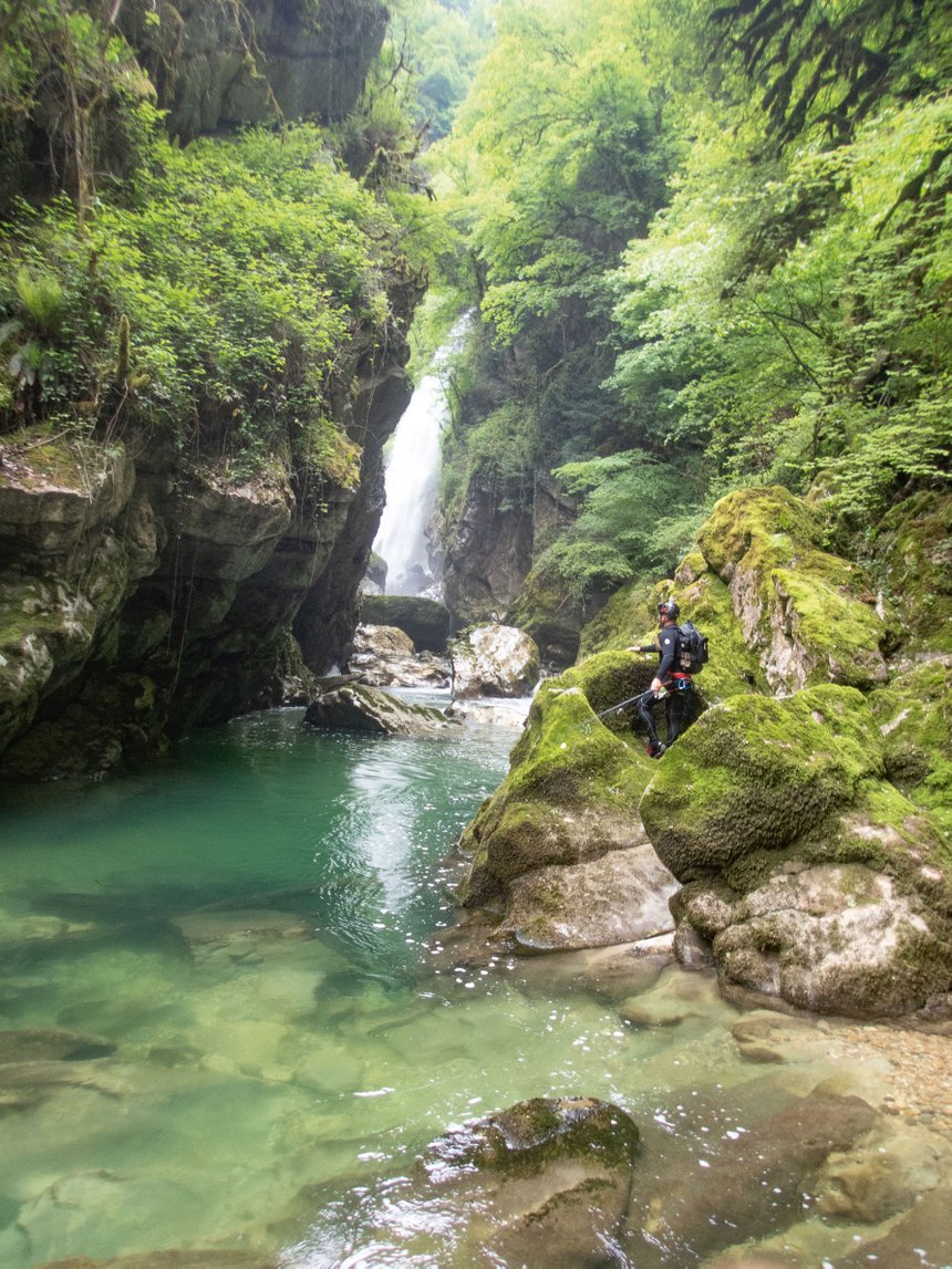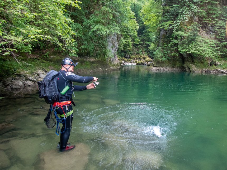 Si le peuplement et la productivité des secteurs de canyoning sont très variables selon le milieu et les possibilités de reproduction, ils offrent en revanche assurément des truites très peu sollicitées et donc à forte capturabilité. Halieutiquement parlant, c’est là évidemment leur principal intérêt. Généralement associés aux massifs calcaires, ils sont bien présents en Corse, dans les Pyrénées et dans les Alpes, mais aussi secondairement dans le Massif central et le Jura. La pêche en canyon est évidemment très exigeante techniquement et physiquement, et ne peut pas s’improviser sans compétences. Les possibilités de guidage n’existent malheureusement pas et cette pêche reste donc pour l’instant confidentielle, réservée à une poignée de passionnés qui maîtrisent les bases de l’escalade et de la nage en eaux vives. J’ai la chance de connaître l’un d’eux (Jonathan Ménétrier ; cf. n°925) qui habite près de mon domicile et je l’ai donc pratiquée plusieurs fois ces dernières années. Pour ceux qui ont envie de s’y mettre, cette pratique sportive n’est toutefois pas inaccessible notamment avec le matériel d’escalade ultramoderne d’aujourd’hui. Il faut néanmoins bien garder en tête que les temps effectifs de pêche sont finalement assez réduits, du fait des contournements ou ascensions de cascades. De même, la taille des poissons, souvent fantasmée dans ces vasques profondes, n’est pas toujours plus élevée que dans les secteurs plus accessibles : elle dépasse rarement les 40 cm sauf gros canyon type Verdon. Le matériel de pêche embarqué, quelle que soit la technique utilisée, devra être robuste et simple. Le lancer fonctionne très bien et permet là encore de partir avec une canne télescopique ultracourte, 1,50 m environ. Le leurre de base peut être la cuillère n°2 ou 3. Très classique, elle est redoutable sur des poissons peu habitués à en voir passer. Il faut voir les attaques hargneuses des farios, parfois jusqu’à ses pieds, pour le comprendre. Les pêcheurs français ont une chance incroyable de pouvoir pratiquer quasiment en accès libre, moyennant une carte interfédérale ou départementale, dans des parcours de montagne magnifiques qui seraient privatisés dans bon nombre de pays. Je ne peux que vous inciter à en profiter, d’autant que cette pratique est aussi excellente pour la santé !